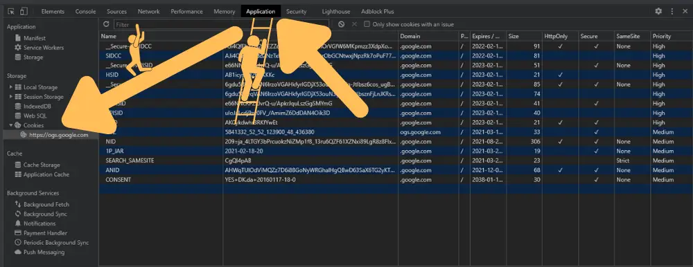 Vælg først fanen “Applikation” og herefter “Cookies” i venstre side.